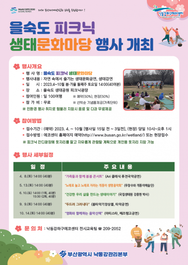[충청뉴스큐] 부산시 낙동강관리본부는 봄·가을 둘째 주 토요일 오후 2시, 주말 을숙도 생태공원으로 나들이 나온 시민 및 관광객을 대상으로 자연생태와 어울리는 다양한 생태·문화행사를 개최한다고 밝혔다.