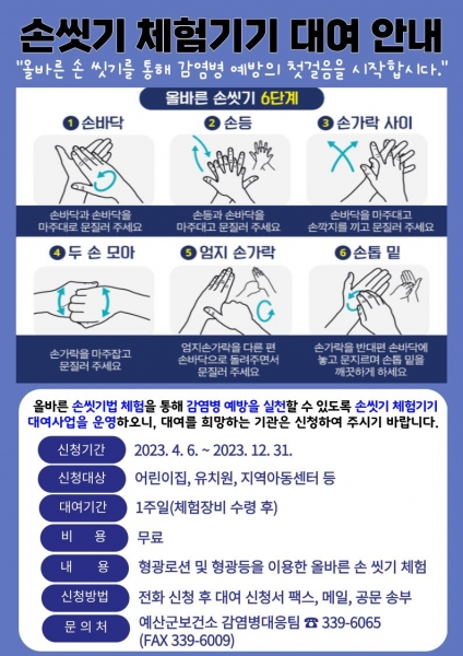[충청뉴스큐] 예산군보건소는 감염병 예방을 위해 관내 어린이집, 유치원 등을 대상으로 ‘손씻기 교육용 뷰박스 무료 대여 사업’을 실시한다.
