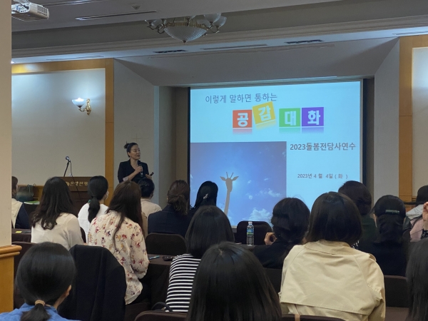 이날 연수는 아산소방서 배방119안전센터 소방관들을 초빙해 심폐소생술 실습 등 돌봄교실에서 발생할 수 있는 다양한 응급처치 상황에 대한 교육이 시작됐으며 이어 사람사이로 공감대화 이진아 충남지부장을 강사로 초빙해 공감 대화법이라는 주제로 연수가 진행됐다.