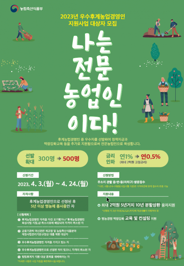서류평가와 현장확인, 전문평가기관의 검증을 거쳐 전국단위 500명을 선발할 예정이며 우수후계농업경영인으로 선정되면 최대 2억원의 육성자금을 융자받을 수 있게 된다.