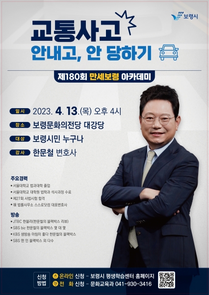 [충청뉴스큐] 보령시는 오는 13일 오후 4시 보령문화의전당 대강당에서 한문철 변호사를 초빙해 ‘교통사고 안 내고 안 당하기’라는 주제로 제180회 만세보령 아카데미 강연을 개최한다.