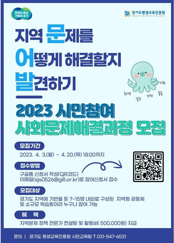 ‘문어발’ 사업은 경기도 내 지역문제를 시민 중심으로 해결하고자 하는 사회적 필요성에 기반해 추진되는 사업으로 7명~15명 내외의 시민공동체, 단체, 동아리 등에서 참여할 수 있으며 경기도평생교육진흥원 누리집 을 통해 20일까지 신청할 수 있다.