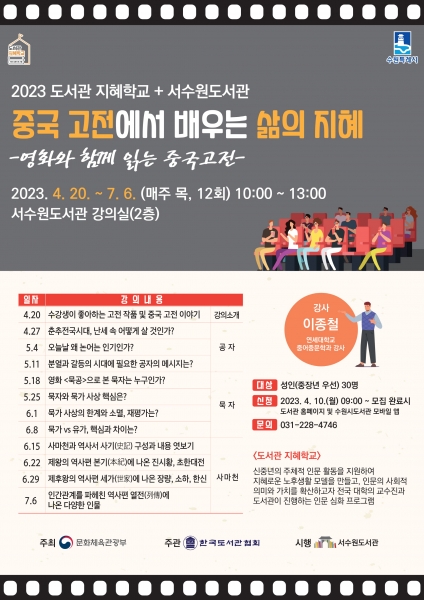 도서관 지혜학교는 ‘중국 고전에서 배우는 삶의 지혜’를 주제로 4월 20일에서 7월 6일까지 매주 목요일 12회에 걸쳐 진행된다.