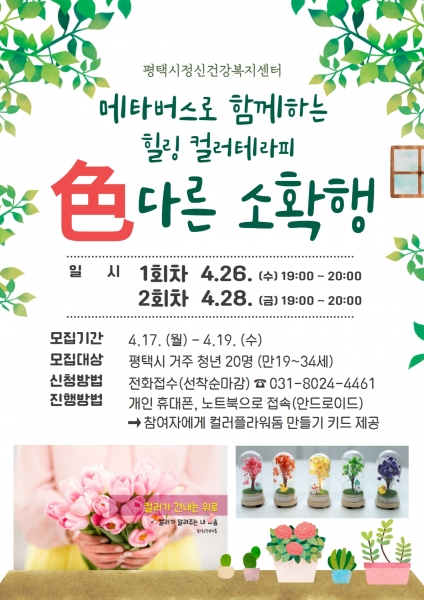 [충청뉴스큐] 평택시정신건강복지센터에서는 평택시 거주 청년을 대상으로 메타버스 힐링컬러테라피 ‘色다른 소확행’을 오는 26일 28일 총 2회 진행할 예정이다.
