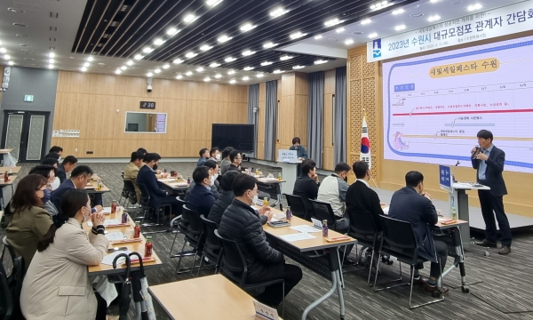 수원시는 11일 시청 중회의실에서 ‘대규모점포 관계자 간담회’를 열고 새빛세일페스타를 내실 있게 추진할 방안을 논의했다.