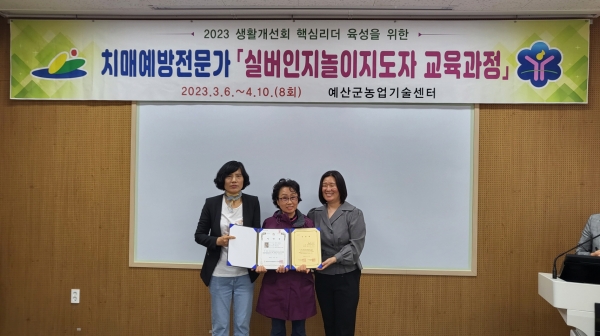 [충청뉴스큐] 예산군농업기술센터는 지난 10일 치매예방전문가 양성을 위한 ‘실버인지놀이지도자 교육과정’ 수료식을 기술센터 가공교육장에서 개최했다.