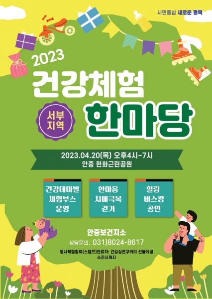 [충청뉴스큐] 평택시 안중보건지소는 서부지역 시민을 대상으로 4월 20일 오후 4시부터 7시까지 안중읍 현화근린공원에서 건강체험 한마당 행사를 운영할 예정이다.