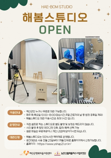 해봄스튜디오 공간대관은 군민 누구나 예산군행복마을지원센터 홈페이지를 통해 신청할 수 있으며 현재는 화요일과 목요일 이틀간 오전 10시부터 오후 4시까지 운영한다.
