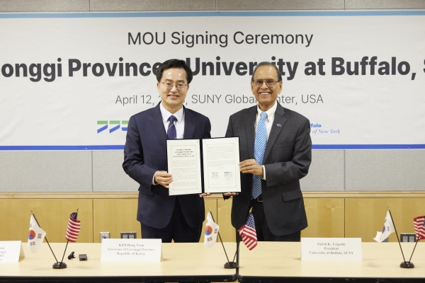 김동연 경기도지사는 현지 시각 12일 오전 미국 뉴욕에 위치한 뉴욕주립대 글로벌센터에서 사티쉬 K. 트리파티 뉴욕주립대버팔로 총장과 이런 내용을 담은 ‘경기도 – 뉴욕주립대버팔로 간 경기청년사다리프로그램 협약서’에 서명했다.
