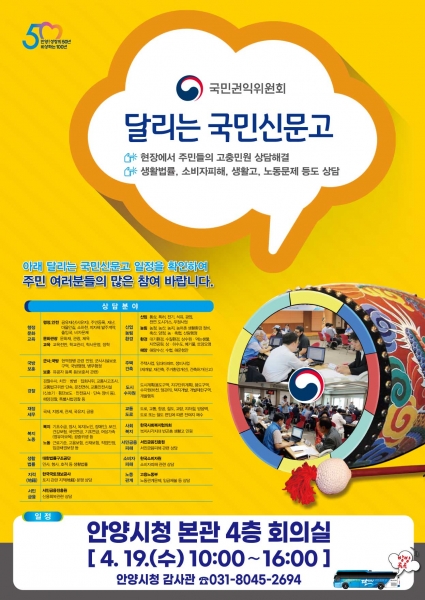 [충청뉴스큐] 안양시는 오는 19일 오전 10시부터 오후 4시까지 시청 4층 회의실에서 국민권익위원회와 공동으로 ‘달리는 국민신문고’를 운영한다고 13일 밝혔다.