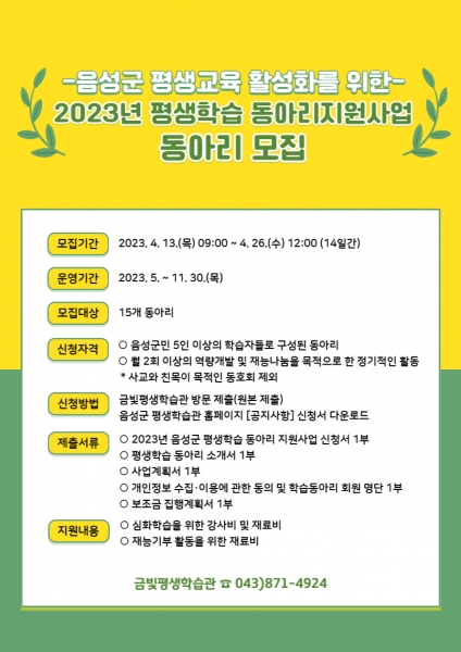 [충청뉴스큐] 음성군은 2023년 평생학습 동아리 지원사업 참여 모집을 오는 26일까지 신청 접수한다고 14일 밝혔다.