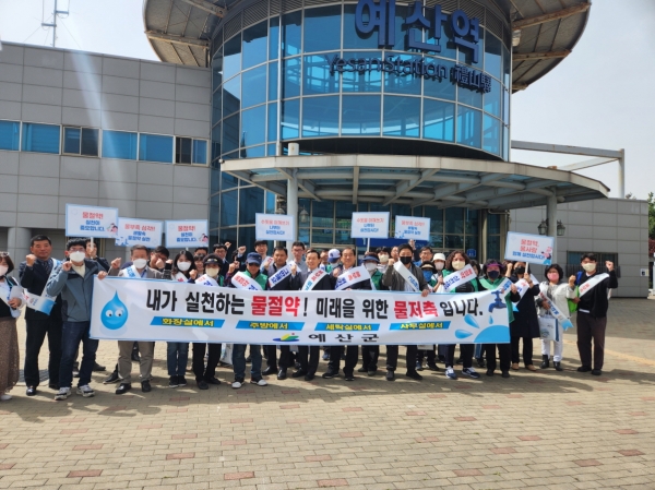 예산군과 충청남도 공무원 등 46명은 유동 인구가 많은 역전시장 인근 거리에서 현수막, 어깨띠, 피켓 등을 활용해 생활 속 물 절약 방법 등을 홍보하며 물 절약 실천에 동참할 것을 당부했다.