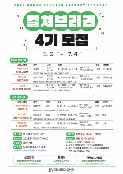 [충청뉴스큐] 화성시립다원이음터도서관은 오는 19일 2023년 상반기 독서문화교실‘컬쳐브러리 4기’참여자를 모집한다고 밝혔다.
