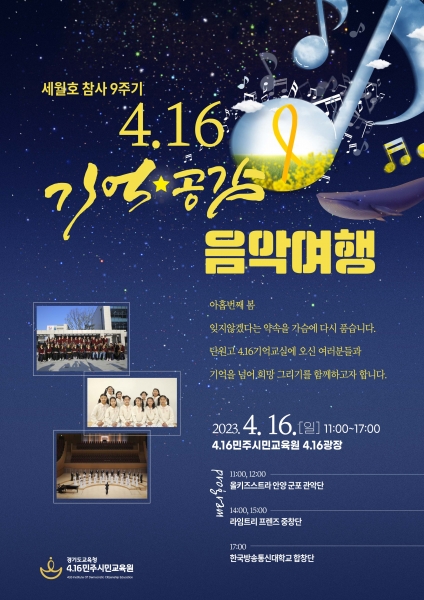 [충청뉴스큐] 4.16민주시민교육원이 오는 16일 세월호 참사 9주기를 맞아 ‘4.16 기억 공감 음악 여행’을 개최한다고 밝혔다.