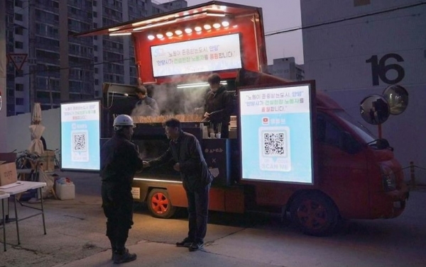 지난 13일 새벽 5시, 센터가 간식차와 함께 방문한 안양 엘프라우드 건설현장은 동트기 전의 어둠 속에서도 작업 준비를 서두르는 건설 노동자들로 분주했다.