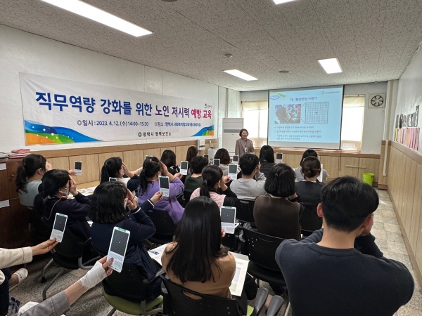 노인 저시력 예방 교육에 참여한 보건소 방문간호사 김OO은 “방문간호 대상자 중 눈이 불편하다고 하시는 분들이 많은데, 오늘 교육을 통해 대상자분들에게 보다 정확한 정보를 제공하고 증상에 따라 병원에 연계해 드릴 수 있을 것 같다”고 말했다.