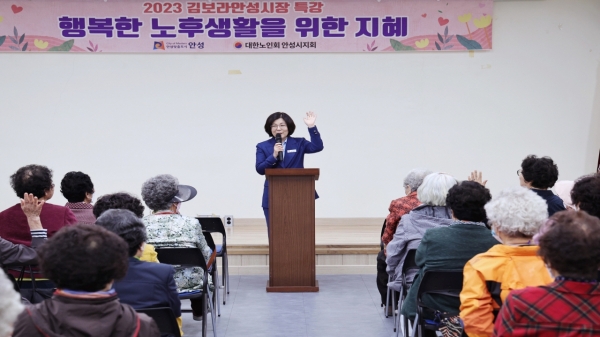 [충청뉴스큐] 김보라 안성시장은 지난 12일 대한노인회 안성시지회 부설 안성 노인대학 대강당에서 수강생 90명을 대상으로 ‘행복한 노후생활을 위한 지혜’ 특강을 실시했다.