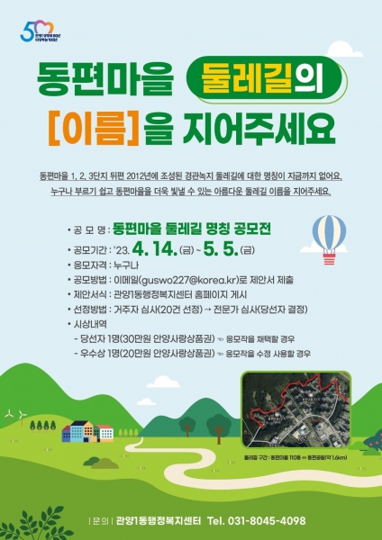 [충청뉴스큐] 안양시 관양1동 행정복지센터는 동편마을 뒤편에 조성된 경관녹지 지역 둘레길의 이름을 공모한다고 14일 밝혔다.