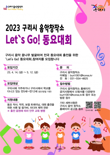 [충청뉴스큐] 구리시는 오는 5월 중 구리시 음악창작소에서 시작하는 ‘Let’s Go 동요대회’의 참여 학생을 4월 14일부터 5월 12일까지 모집한다고 밝혔다.