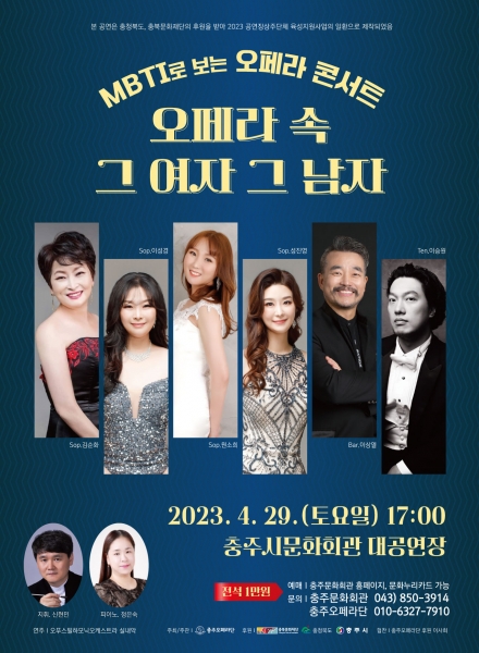 [충청뉴스큐] 충주오페라단은 충북문화재단이 주관하는 2023년 공연장 상주단체육성 지원 공모사업의 일환으로 MBTI로 보는 오페라콘서트를 오는 29일 토요일 오후 7시에 공연한다고 밝혔다.