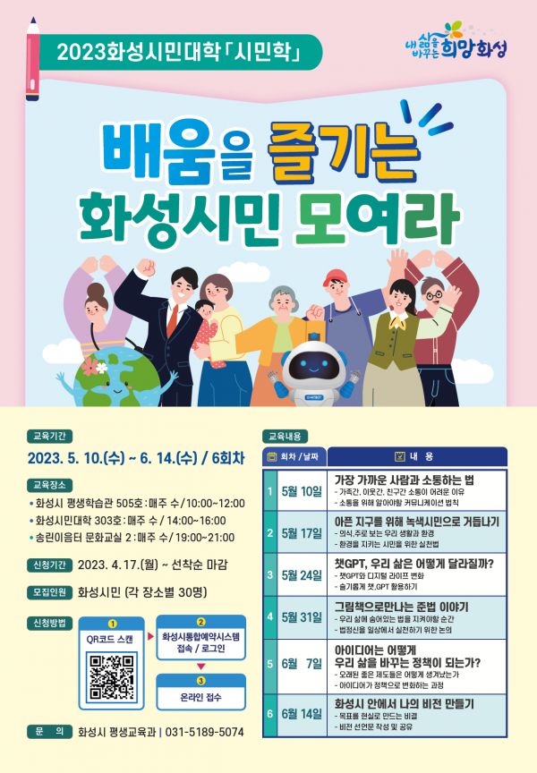 [충청뉴스큐] 화성시가 2023년 화성시민대학 시민학 과정 ‘배움을 즐기는 화성시민 모여라’수강생을 모집한다.