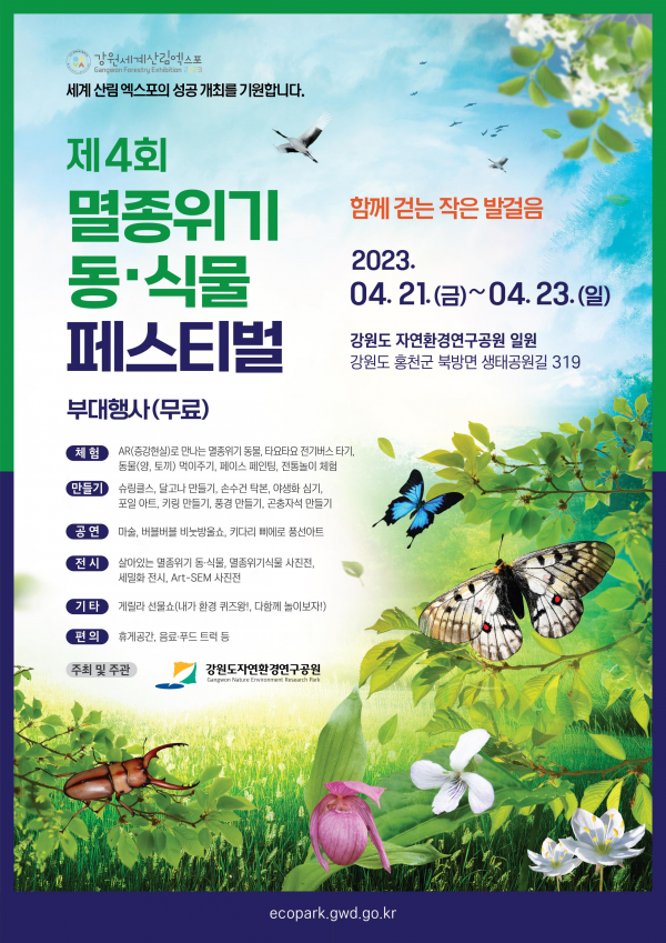 [충청뉴스큐] 강원도자연환경연구공원은 2023. 4. 21 ~ 23까지, “제4회 멸종위기 동식물 페스티벌“을 개최한다고 밝혔다.