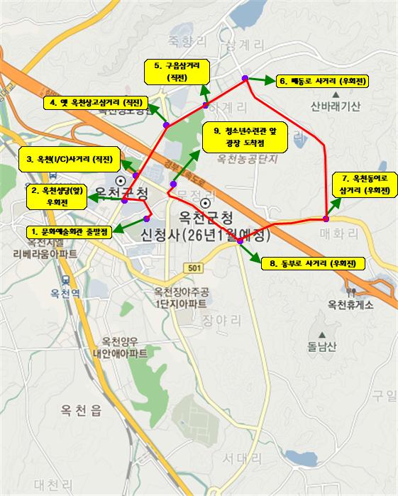 라이딩 코스는 문화예술회관 광장을 출발해 옥천성당 앞 ~ 군청 앞 ~ 구읍삼거리 ~ 매동로 사거리 ~ 옥천동이로 삼거리 ~ 동부로 사거리 ~ 청소년 수련관 앞 광장으로 돌아오는 코스이다.