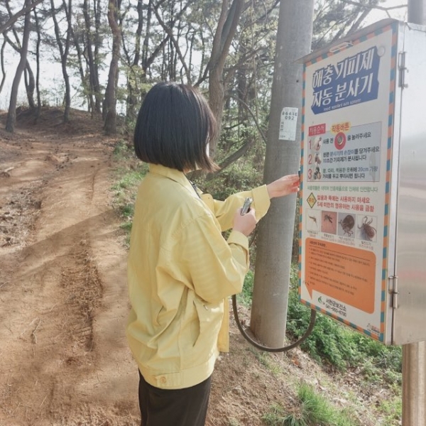 군은 진드기 유행 시기에 대비해 진드기가 주로 서식하는 주요 등산로 출입구 9곳에 해충기피제 자동분사기를 설치했다.