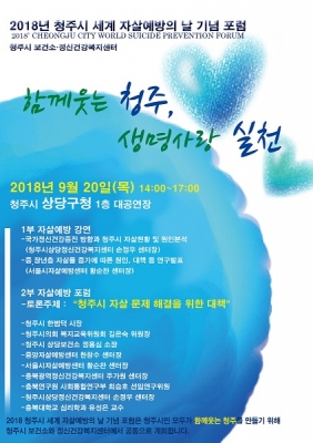 [충청뉴스Q] 청주시 보건소와 정신건강복지센터가 2018년 세계 자살예방의 날을 맞아 오는 9월 20일 오후 2시 상당구청 대공연장에서 청주시 세계 자살예방의 날 기념 포럼을 개최한다.