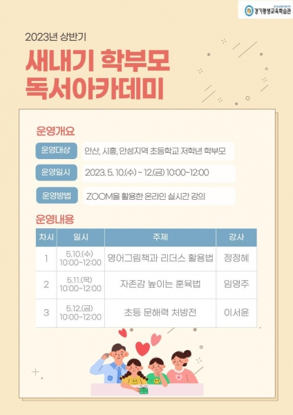 [충청뉴스큐] 경기평생교육학습관이 안산·시흥·안성지역 초등학교 저학년 학부모를 대상으로 ‘새내기 학부모 독서아카데미’를 운영한다.