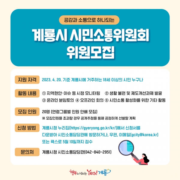 시는 민선8기 공약사업인 ‘계룡시 시민소통위원회’ 출범을 앞두고 시민의 목소리를 가장 가까이에서 듣고 대변해 줄 위원을 모집한다.