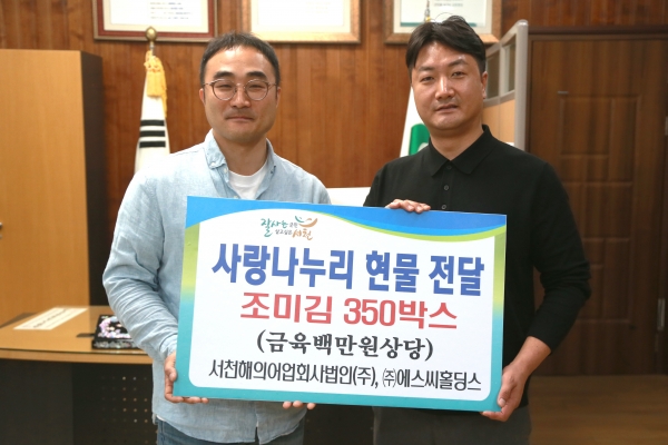 [충청뉴스큐] 서천해의어업회사법인㈜과 ㈜에스씨홀딩스가 19일 관내 저소득층 가구와 서천군좋은이웃푸드마켓에 전달해달라며 600만원 상당의 조미김을 서천군에 기탁했다.