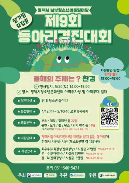2023년 제1차 평택시 남부청소년어울림마당 ‘제9회 청소년동아리경진대회’는 ‘환경’을 주제로 오는 5월 20일에 개최된다.