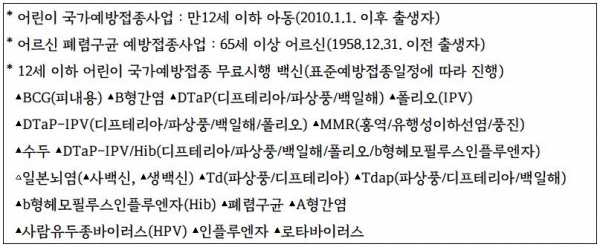 현재 만 12세 이하 어린이를 대상으로 18종 국가필수예방접종이 무료로 시행되고 있으며 만 65세 이상 어르신에게는 폐렴구균과 인플루엔자 예방접종을 무료로 지원하고 있다.