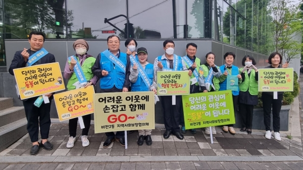 이번 활동은 지역사회보장협의체 위원과 행정복지센터 직원들이 함께 참여했으며 관내 유동인구 밀집지역인 비전동 경남아너스빌 아파트 사거리에서 피켓 홍보와 이동하는 지역 주민들에게 복지 사각지대 발굴 안내문을 배부했다.