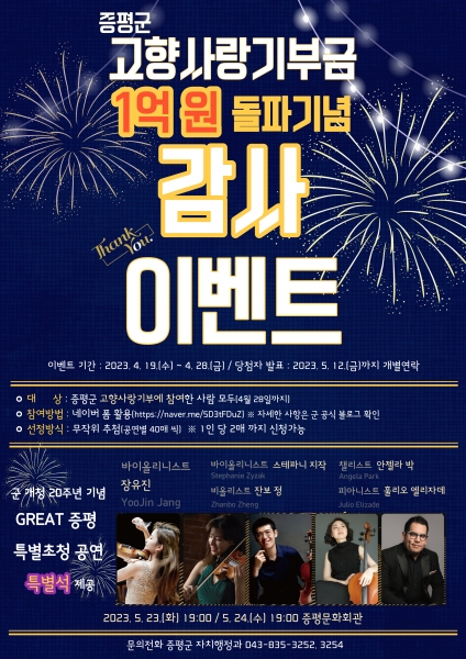 이재영 증평군수는 “많은 분들의 응원 덕분에 도내 처음으로 모금액 1억원을 달성할 수 있었다”며 “기부자 예우 차원에서 마련한 이벤트인 만큼 많은 관심 부탁드린다”고 말했다.