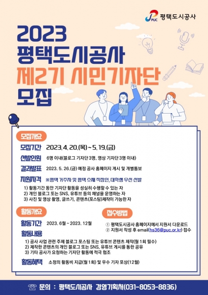 [충청뉴스큐] 평택도시공사가 시민과 함께하는 소통 문화 확산을 위해‘제2기 시민기자단’을 모집한다고 밝혔다.