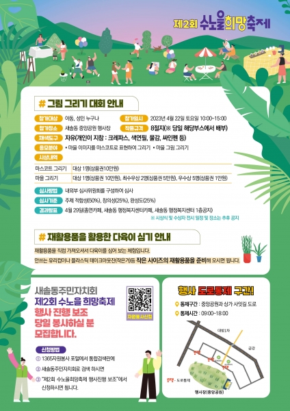 축제는 새솔동 중앙공원 잔디광장에서 오전 10시부터 오후 5시 반까지 진행되며 새솔동 주민이라면 누구나 무료로 참여가능하다.