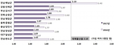 전국에서 합계출산율이 가장 높은 곳은 전남 해남군으로 강원도 인제군이 그 뒤를 따랐다.