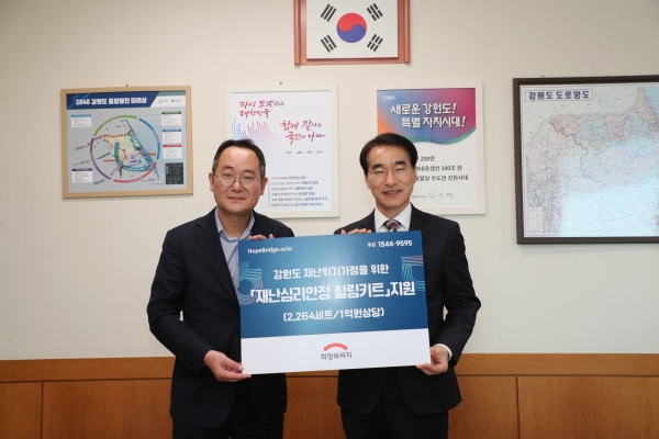 김명선 강원도 행정부지사는 “힐링키트 지원을 통해 재난경험자 및 재난취약계층들이 심리적 안정을 찾고 건강하게 일상으로 돌아가는데 큰 도움이 될 수 있을 꺼라 기대된다”고 밝히며 4.11. 강릉 산불피해 지역에 긴급구호지원을 비롯해 도내 재난발생 시 협력 해주는 희망브리지 전국재해구호협회에 감사의 인사를 전했다.