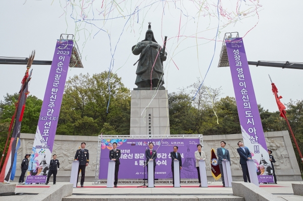 이어 박 시장의 탄신주간 선포 선언을 시작으로 성공적인 축제 기원과 함께 아산시 자율방범대원들이 준비한 현충사 충무정에서 취수한 물과 신천탕의 온천수로 합수된 물로 이순신 동상을 씻기는 순으로 마무리됐다.