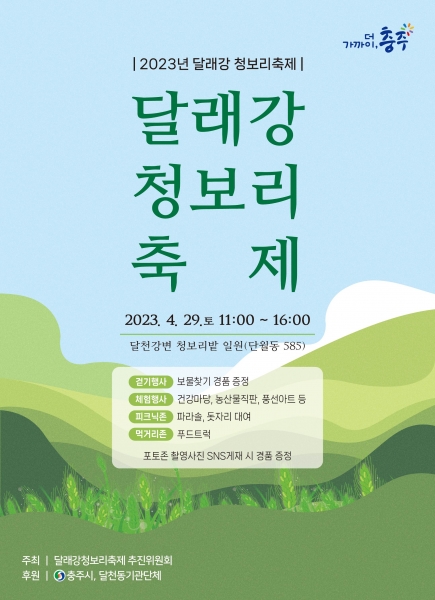 [충청뉴스큐] 충주시 달천동행정복지센터는 오는 29일 달천강변 청보리밭 일원에서 ‘2023년 달래강 청보리 축제’를 개최한다고 밝혔다.