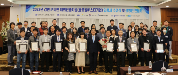 [충청뉴스큐] 강원도는 4월 24일 춘천 베어스호텔에서 도내 수출 유망 중소기업의 지식재산 창출 역량을 강화하고 글로벌 강소기업으로 육성하기 위해 선정된 ‘강원 IP기반 해외진출지원’ 11개사에 대한 인증서 수여식을 진행했다고 밝혔다.