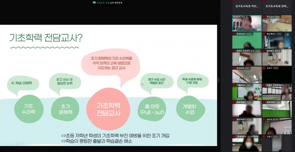 이번 온라인 연찬회에서 참석자들은 기초학력전담교사에 대한 이해, 기초학력전담교사-담임교사의 협력적 지도 사례 공유, 노션 어플을 활용한 학습이력관리 방법 연수의 시간을 가졌다.