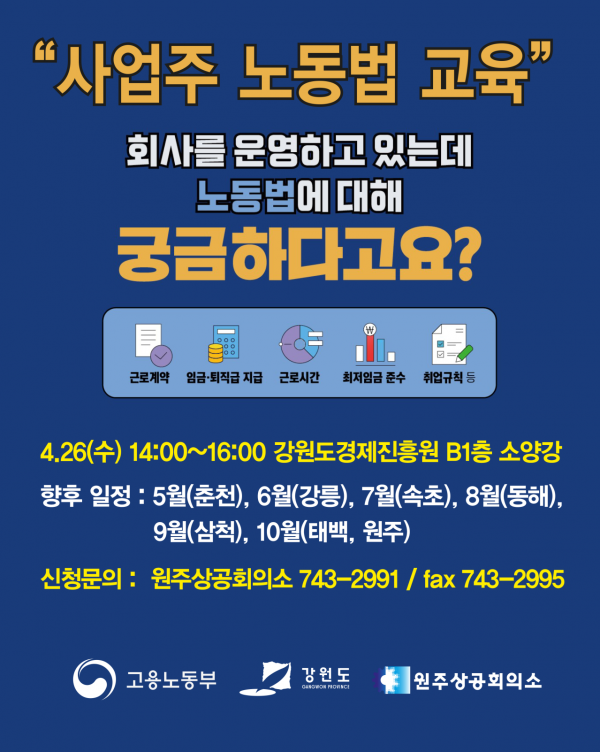 [충청뉴스큐] 강원도는 2023년 사업주 노동법교육을 4.26 강원도경제진흥원에서 실시 한다고 밝혔다.