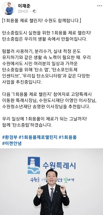 이재준 시장을 비롯한 수원시 공직자들은 지난 3월 탄소중립을 실천하고 일회용품 사용을 줄일 것을 서약했고 수원시는 ‘일회용품 줄이기 운동’을 확산하기 위해 공직자를 대상으로 일회용컵 반입자제 릴레이캠페인을 펼치고 있다.