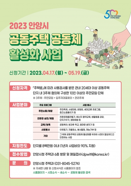 [충청뉴스큐] 안양시가 아파트 등 공동주택의 이웃 간 소통 확대와 살기 좋은 주거문화를 조성하기 위한 ‘2023년 공동주택 공동체 활성화 지원사업’에 참여할 공동주택 단지를 모집한다고 25일 밝혔다.