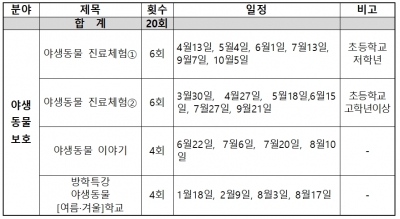 교육 프로그램은 야생동물 진료체험교실, 야생동물 이야기 방학 특강-야생동물 학교로 구성되어 있으며, 야생동물치료센터 내 생태체험교육장에서 실시된다.