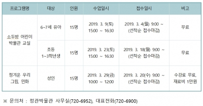 [충청뉴스큐] 부산시 정관박물관은 오는 3월부터 11월까지 매월 2·4째 토요일 오후 3시에 유아 및 초등 저학년을 대상으로 토요 상설 교육프로그램 ‘소두방 어린이 박물관 교실’을 운영한다고 밝혔다.