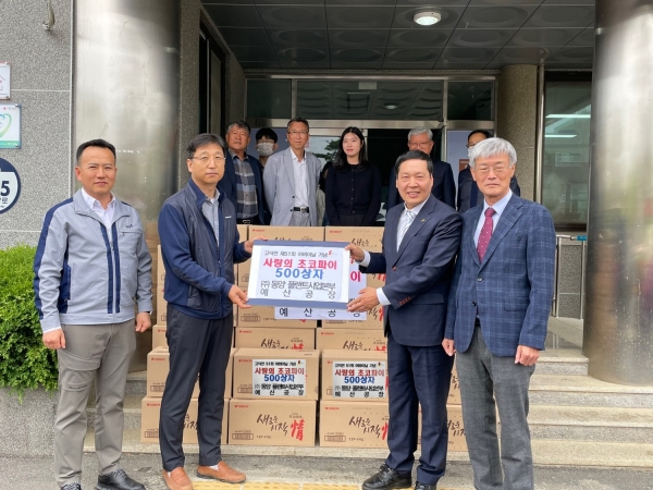 [충청뉴스큐] 예산군 고덕면 소재 ㈜동양플랜트사업본부 예산공장은 지난 25일 어버이날을 앞두고 관내 어르신을 위한 초코파이 500상자를 기탁했다.